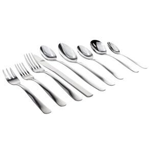 Ao adquirir o conjunto Malibu, você recebe 12 colheres de mesa, 12 garfos de mesa, 12 facas de mesa, 12 colheres de sobremesa, 12 garfos de sobremesa, 12 garfos de torta, 12 colheres de chá, 6 colheres para refresco e uma colher redonda para servir alimentos com mais facilidade.