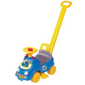 Vem com um celular, capacete, apoio de pés e uma haste para a mamãe levar o bebê para passear.