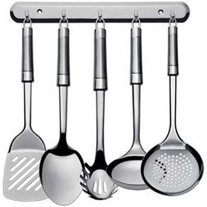 Ele vem com uma escumadeira, uma concha, uma colher para arroz, uma espátula para misturas, um pegador para massas e um suporte. Todos os utensílios domésticos são feitos em aço inox, qualidade de aço que confere praticidade no manuseio e maior durabilidade às peças.